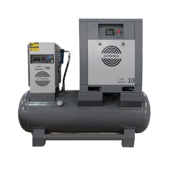 Винтовой компрессор ULTRATECH AIRSET предназначен для производства сжатого воздуха для небольших предприятий малого и среднего бизнеса, с потребностью до 2,27 кубометров сжатого воздуха в минуту (м³/мин). Серия ULTRATECH AIRSET — стационарные маслонаполненные винтовые компрессоры, оборудованные микропроцессорной системой управления и контроля, закрытым звукопоглощающим кожухом. В компрессорах реализована ременная передача, электродвигатель высокого КПД и эргономичный корпус. При производстве компрессоров используются комплектующие от ведущих европейских производителей. Остаточное содержание масла в сжатом воздухе соответствует общепромышленным требованиям к качеству сжатого воздуха.